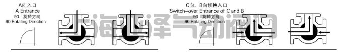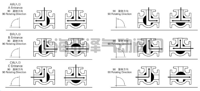 電動(dòng)三通球閥分L型和T型,介質(zhì)流通方向見(jiàn)下圖。L型電動(dòng)三通球閥適用于介質(zhì)流向的切換,能使相互垂直的兩個(gè)通道連通:T型電動(dòng)三通球閥適用于介質(zhì)的分流、合流或流向 切換,T型孔道可以使三個(gè)通道互相連通或使其中兩個(gè)通道連通,電動(dòng)三通球閥一般采用三個(gè)閥座結(jié)構(gòu),亦可根據(jù)用戶要求采用四閥座結(jié)構(gòu)。